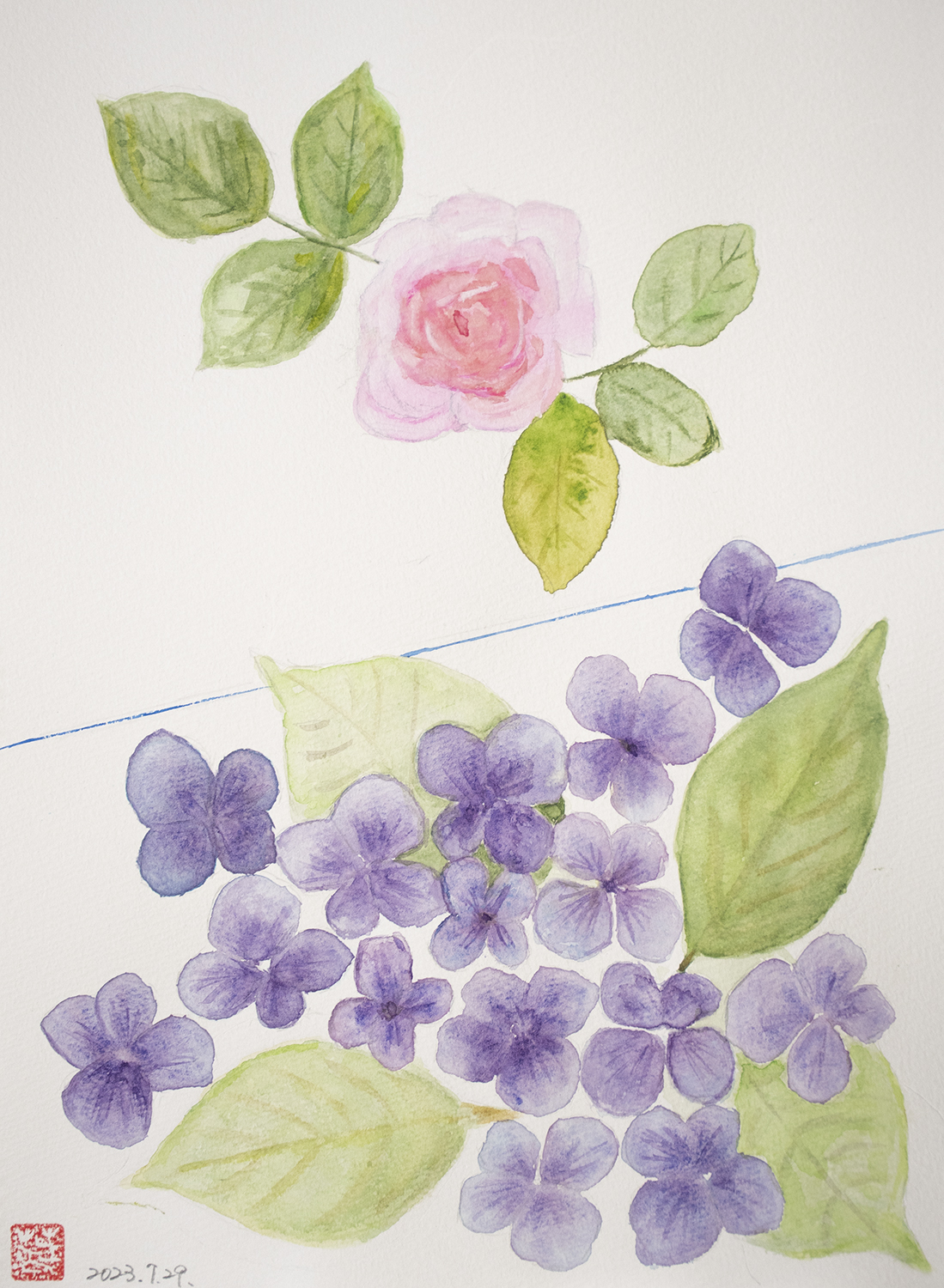 2023.07 「紫陽花と薔薇」 水彩画