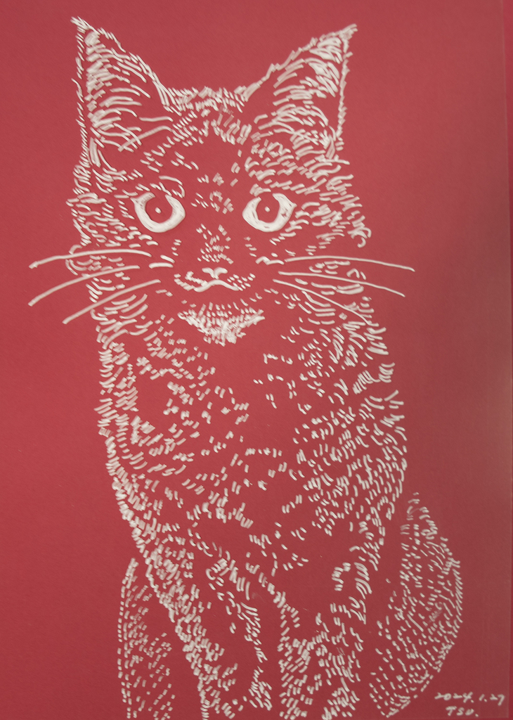 2024.01 「猫」 透明フィルムに白ペン・赤い台紙